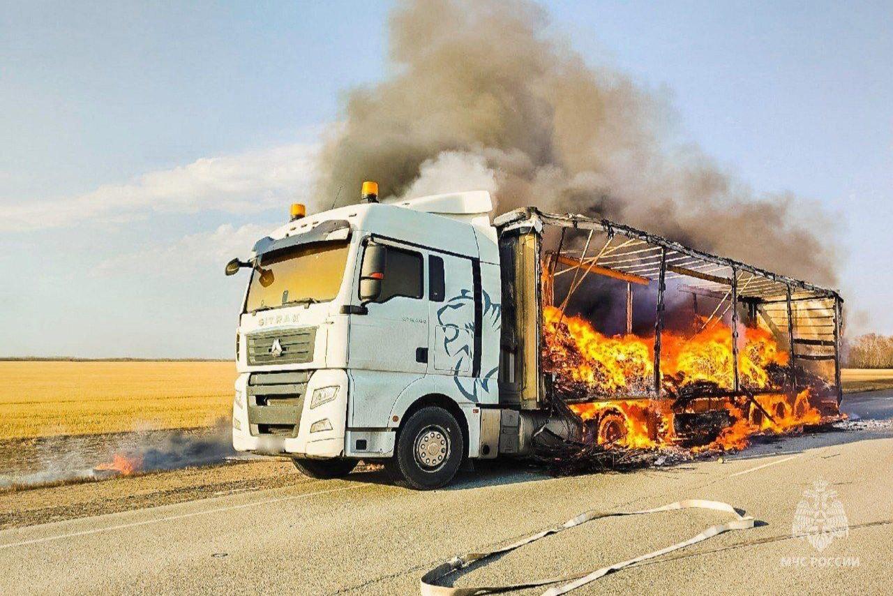 На трассе в Омской области полыхала фура — видео с места ЧПГруз, который перевозил китайский автомобиль, выгорел полностью